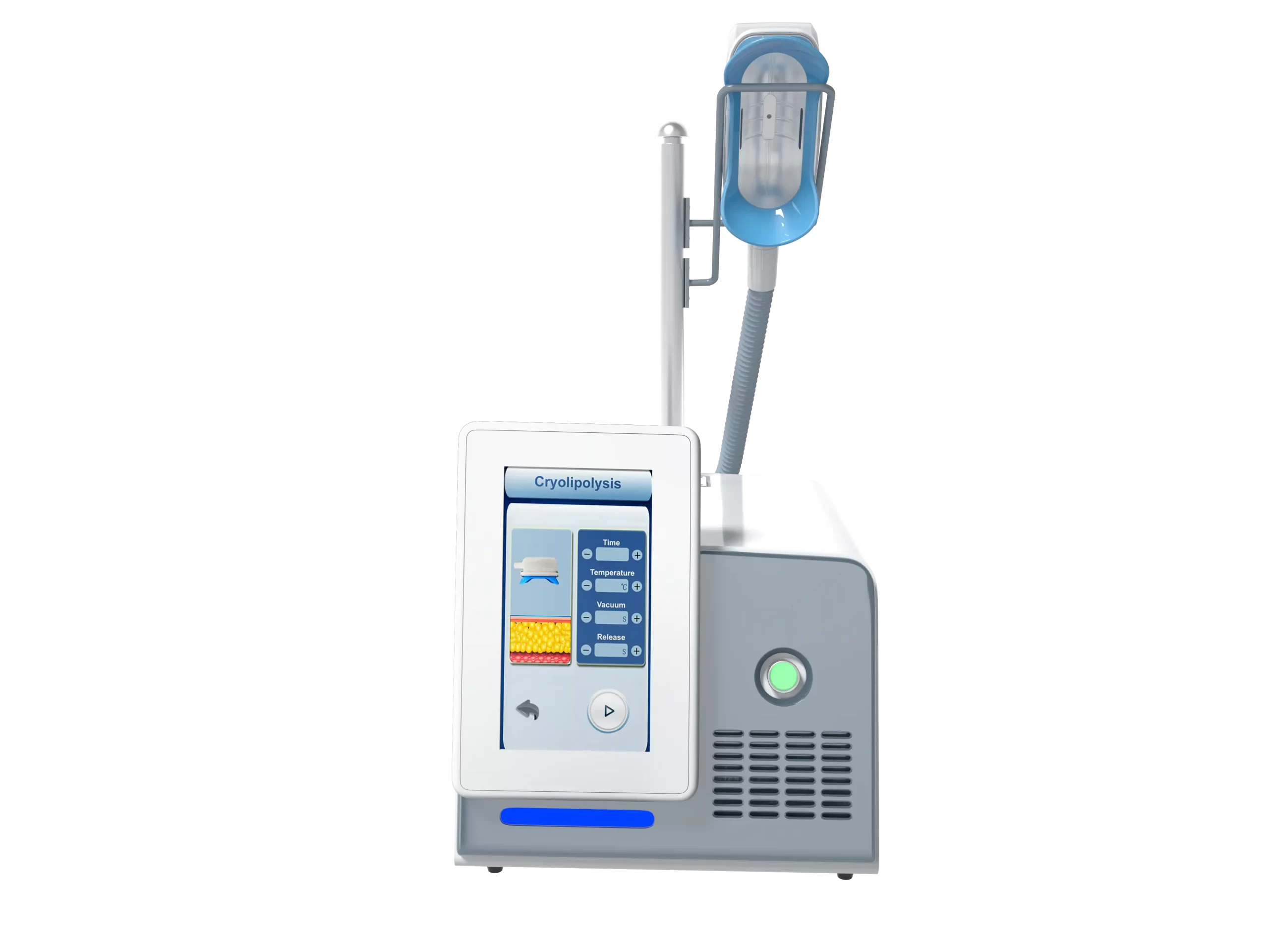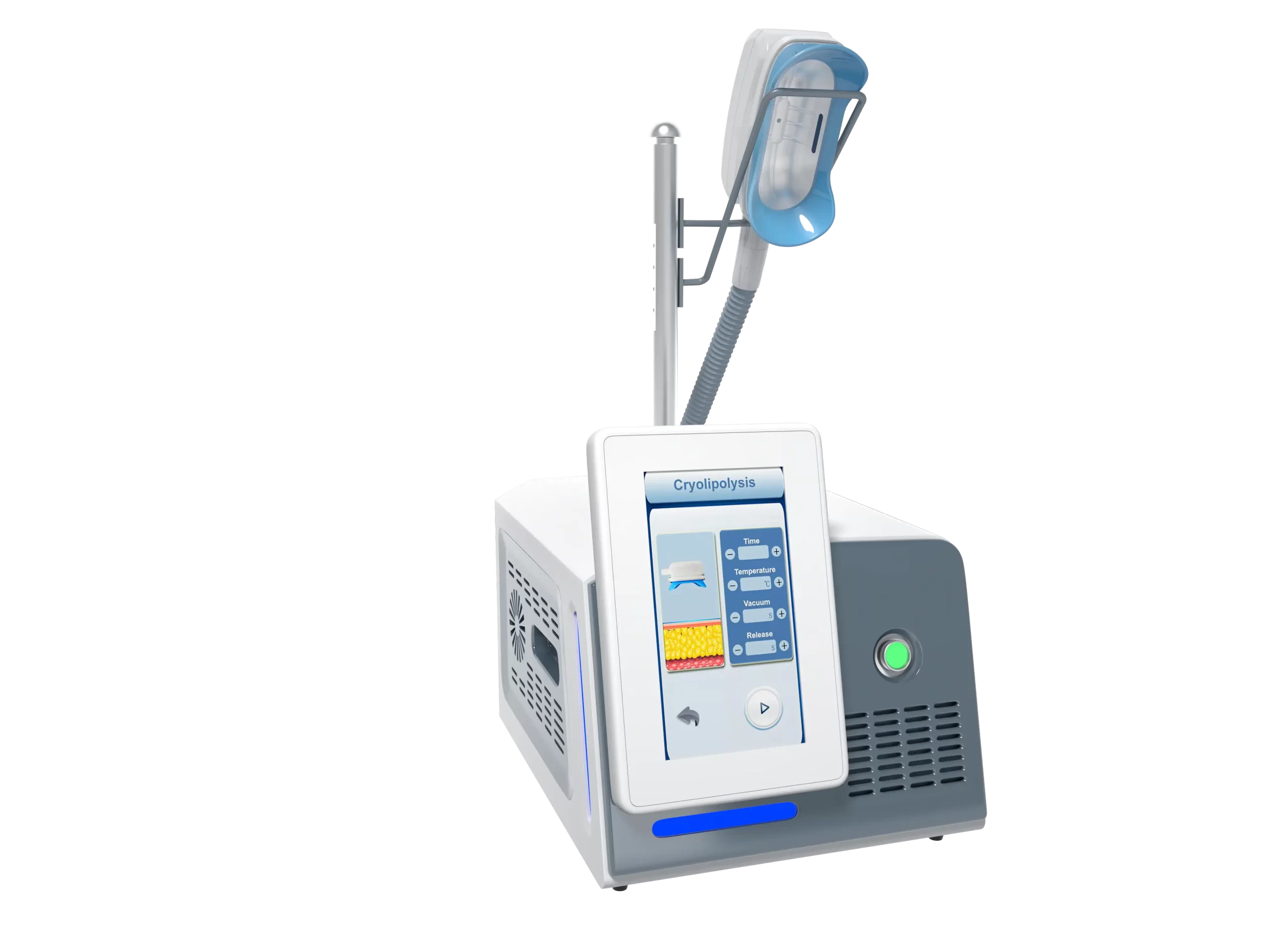 There are three 360° cryolipolysis handles to choose: Big cryo handle;Small Cryo handle;Chin Cryo handle,the big and small handle each along with four pcs bell mouth plates of different size.
